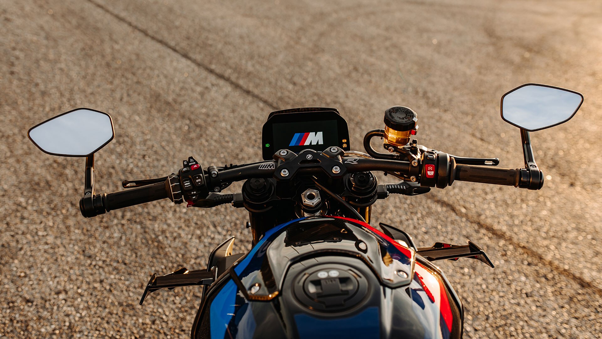 Dominant front, aggressive rear: M R at its best. Take your seat on the M seat at the perfect height and reach for the widened tubular handlebar with lasered “BMW M 1000 R” lettering. You stare into the handlebar end mirrors. Sound on, light on: the M logo appears in the LED headlight. You know the road is yours.